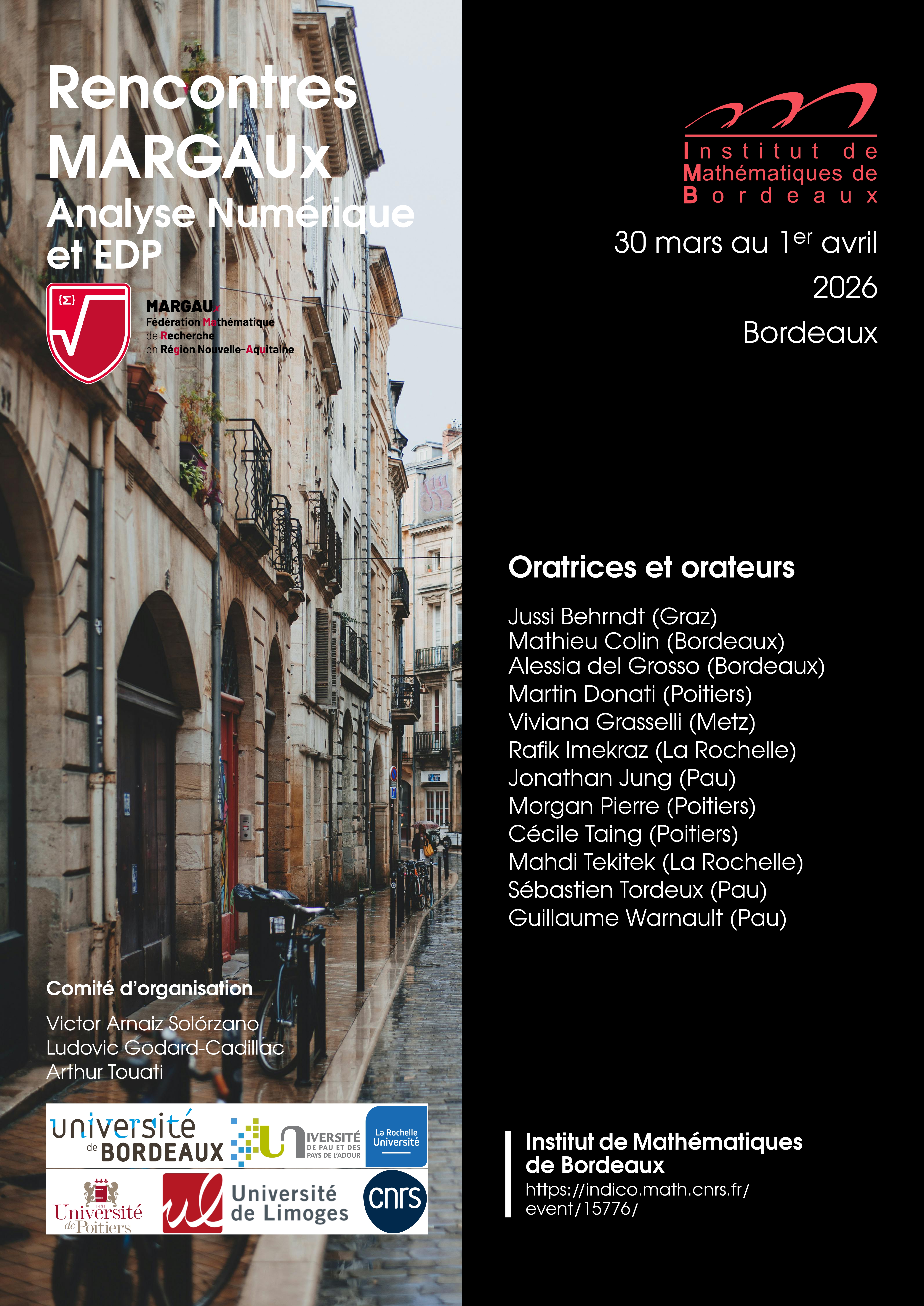 Les journées "Rencontres MARGAUx : Analyse numérique et EDP" ont pour but de réunir la communauté des chercheurs et chercheuses de la région autour des problèmes liés aux EDP, à la théorie spectrale, à l'analyse numérique et à la simulation informatique des phénomènes physiques et biologiques. Ce sera l'occasion d'échanger sur les dernières avancées de la recherche et initier de nouvelles collaborations scientifiques.